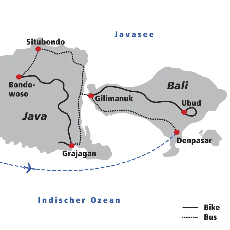 Am Morgen starten wir mit dem Rad und fahren in Richtung West-Bali-Nationalpark. Die Strecke führt durch kleine Dörfer, später durch Farmer- und Buschlandschaft – mit etwas Glück entdecken wir unterwegs exotische Vögel oder Makaken. Nach einer Bootsfahrt zur Insel Menjangan tauchen wir mit Maske und Schnorchel ein in die atemberaubende Unterwasserwelt mit farbenfrohen Fischen. An der Steilwand mit den sonnenüberfluteten Korallengärten tummeln sich verschiedene tropische Fische, wie Papageien- und Anemonenfisch. Frisch abgekühlt setzen wir unsere Radtour entlang des Westbali-Nationalparks fort und erreichen schließlich den Pier von Gilimanuk. Dort heißt es Abschied nehmen von Bali – mit der Fähre setzen wir über zur Nachbarinsel Java. Die einstündige Überfahrt bringt uns nach Ketapang, wo ein Transfer zum Basecamp des Vulkans Ijen erfolgt. → 35 km