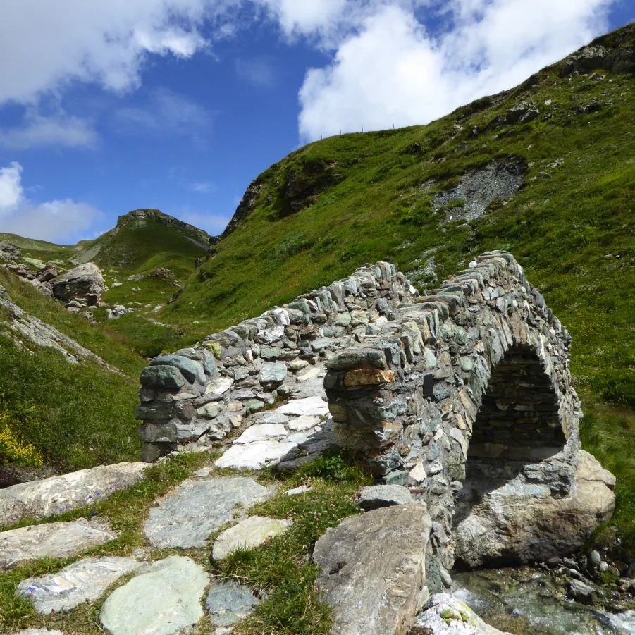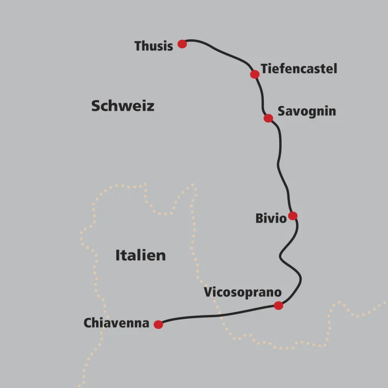 Auf der alten Septimerpass-Strasse stossen wir Schritt und Tritt auf Spuren der vergangenen Jahrhunderte. Über den Pass, im Hochmittelalter einer der wichtigsten alpenquerenden Transitverbindungen, zogen Händler und Heere, Könige und Kaiser. Am Ende des Weges befinden wir uns in einem anderen Tal, einer anderen Kultur und einem anderen Sprachraum. Vicosoprano, der alte Hauptort des Tals, beherbergt die Kirche Santa Trinità und das Pretorio, der alte Gemeinde- und Gerichtssitz mit Prangerblock und Folterkammer. → Wz 5¾ Std.