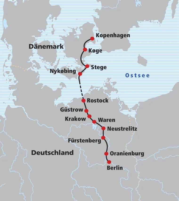 Per Velo zum Fährhafen Rostock ca. 12 km. Die Fährüberfahrt nach Gedser (inkl.) Dauer ca. 2 Stunden. Auf dänischer Seite geniessen Sie die schöne Strecke über Deiche und durch kleine Wäldchen entlang der schönsten Strände Falsters. Übernachtung in Nykøbing/Falster.