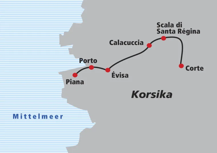 Am Morgen Möglichkeit zur Rückfahrt mit dem öffentlichen Bus nach Ajaccio (ausgenommen sonntags und feiertags von April bis Juni, September und Oktober; Fahrplanänderungen vorbehalten!). Der Transfer von Piana nach Ajaccio ist nicht inbegriffen und zahlbar vor Ort. Falls die Zeit es erlaubt, können Sie einen Spaziergang in die Ficaghjola-Bucht unternehmen.