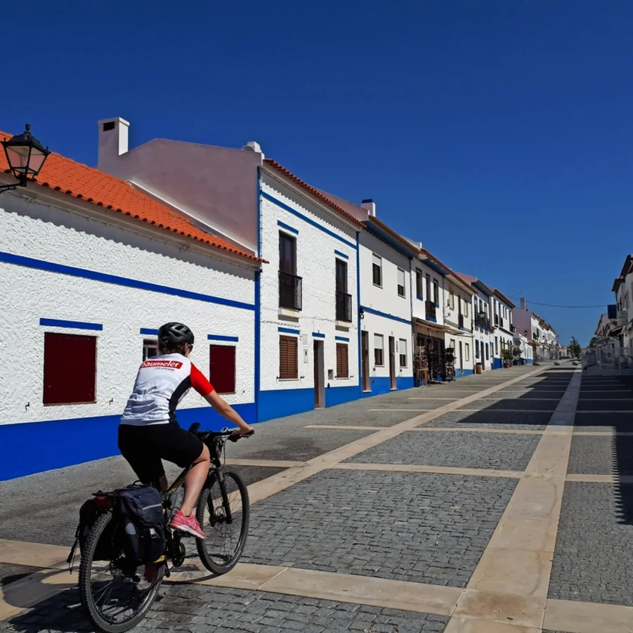 Die Etappe beginnt mit einer Fährüberfahrt (nicht inklusive) durch das Naturschutzgebiet der Sado-Mündung. Die Velotour beginnt auf der Halbinsel Troia. Bei der Durchfahrt durch Comporta können Sie zahlreiche Reisfelder beobachten. Angekommen im Alentejo können Sie die wunderschöne und flache Region geniessen. Die Felder sind im Frühling voll von Wildblumen, Sonnenblumen und Weinreben. Die endlosen Sandstrände mit dem kristallklaren Wasser sind eine der schönsten des Landes. Die weissen Häuser sind typisch für die charmanten Alentejo-Dörfer. Im Alentejo gibt es viele geschichtliche Sehenswürdigkeit wie z.B. beeindruckende Burgen, westgotische Kirchen oder römische Baufragmente.