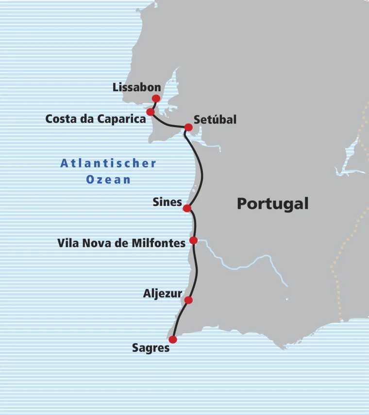 Sie geniessen den letzten Velotag in der Algarve. Sie fahren über die Hügel bis an die Küste und erreichen schliesslich Sagres. Sagres ist eines der wichtigsten Gebiete an der Algarve in Bezug auf sein ausserordentlich reiches Erbe (von der Festung bis zu den alten Menhiren). Seine Bedeutung für die Weltgeschichte ist enorm und zeugt von einer Fülle historischer Ereignisse, Geschichten und Legenden. Die hohen Klippen erheben sich fast senkrecht aus dem Atlantik bis zu einer Höhe von 75 Metern. Besuchen Sie den Leuchtturm am Kap St. Vincent und lassen Sie den wunderschönen Sonnenuntergang im südwestlichsten Punkt von Portugal und Europa auf sich wirken.