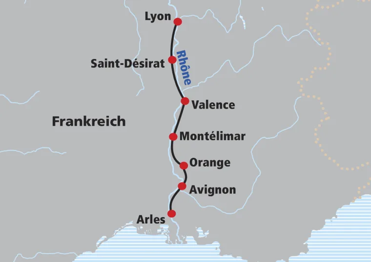 Bereits nach wenigen Kilometern taucht das futuristische Museum „des Confluences“ auf, spektakulär liegt es auf einer Insel am Zusammenfluss von Rhône und Saône. In Städten wie auch in Lyon ist mit viel Verkehr zu rechnen. Wir empfehlen Ihnen daher eine kurze Zugfahrt bis Givors (nicht inkl.). Sie folgen den Windungen Ihrer „Begleiterin“, der Rhône und erreichen schon bald Vienne mit vielen Spuren der alten römischen Kolonie. Beeindrucken werden Sie der Tempel des Augustus und der Livia sowie das größte römische Theater Galliens. Weiter geht es direkt am Ufer der Rhône entlang. Linker und rechter Hand ragen steil die Weinberge der Côtes du Rhône auf. Sie bleiben jedoch in der Ebene und radeln bald durch ein Naturschutzgebiet mit vielen Beobachtungsposten zum Bestaunen der Flora und Fauna. Weiter geht’s durch schattenspendende Auwälder.