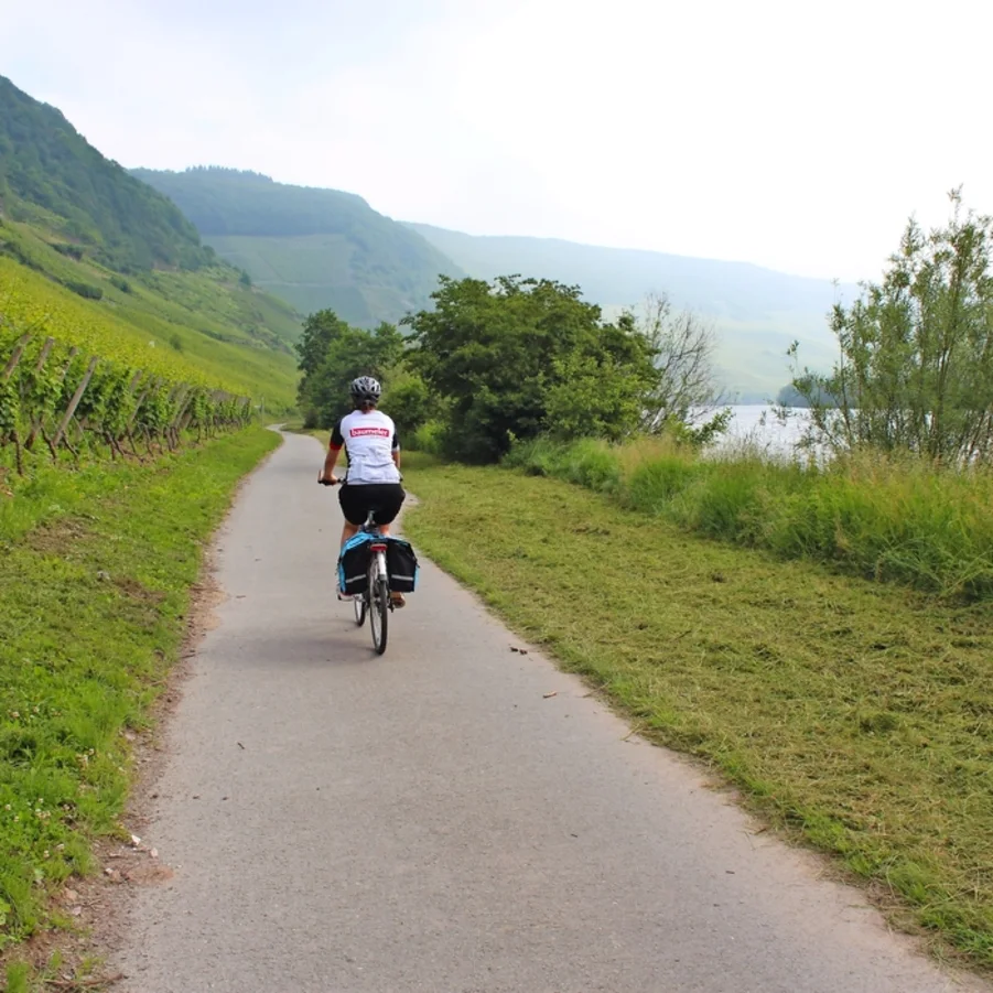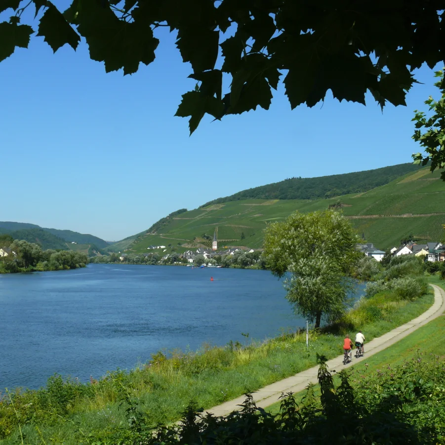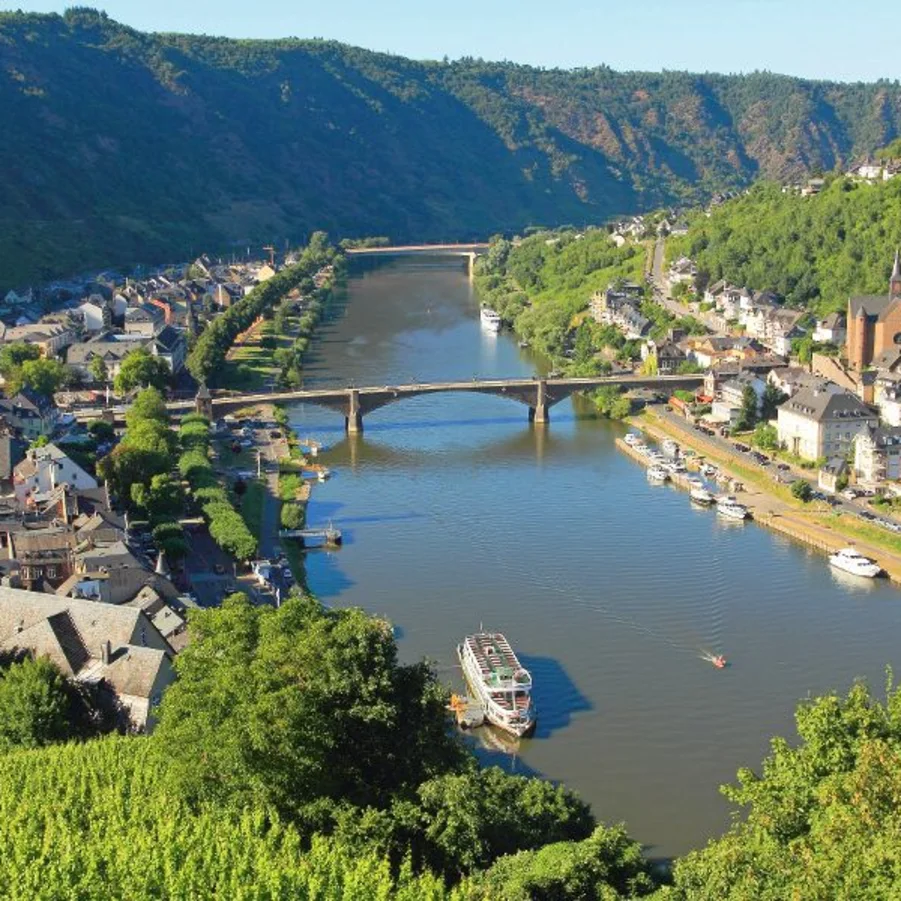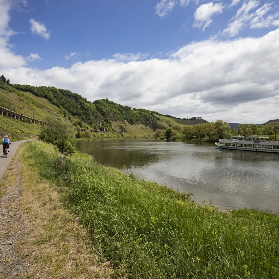 Nach Moselkern (Möglichkeit die sehenswerte Burg Eltz zu besichtigen); vorbei an der Burg Bischofstein und Hatzenport (sehenswerter Fährturm), sowie der Burg Thurant erreichen Sie die Weinbaudörfer Kobern-Gondorf und Güls. Die letzten 6 km radeln Sie entlang der Mosel bis zum Deutschen Eck (Zusammenfluss von Mosel und Rhein) im Zentrum von Koblenz (Festung Ehrenbreitstein, Kurfürstliches Schloss, Mosel- und Rheinpromenade, lebhafte Altstadt).