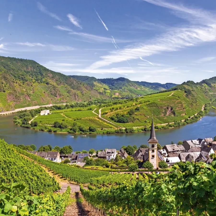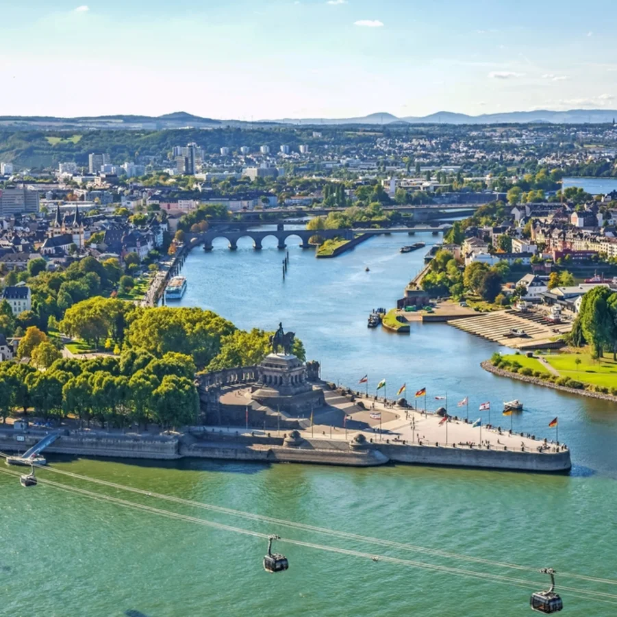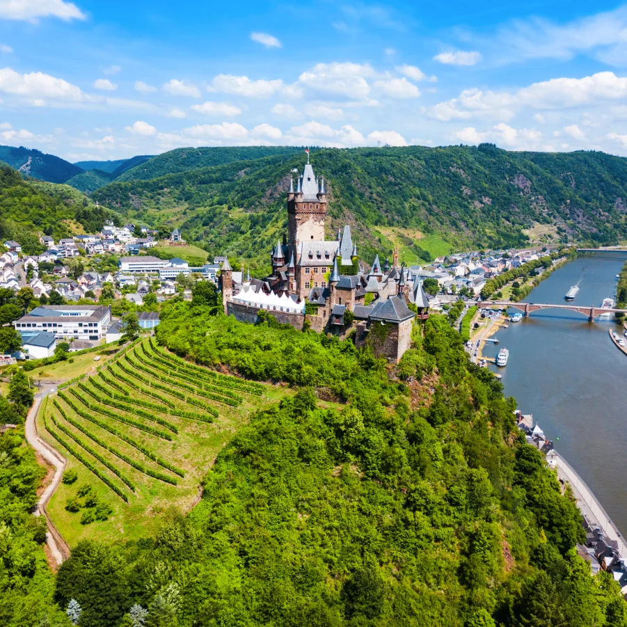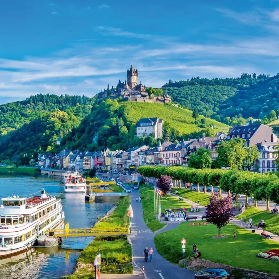 Nach Moselkern (Möglichkeit die sehenswerte Burg Eltz zu besichtigen); vorbei an der Burg Bischofstein und Hatzenport (sehenswerter Fährturm), sowie der Burg Thurant erreichen Sie die Weinbaudörfer Kobern-Gondorf und Güls. Die letzten 6 km radeln Sie entlang der Mosel bis zum Deutschen Eck (Zusammenfluss von Mosel und Rhein) im Zentrum von Koblenz (Festung Ehrenbreitstein, Kurfürstliches Schloss, Mosel- und Rheinpromenade, lebhafte Altstadt).