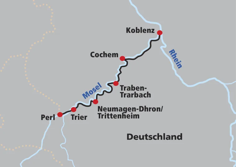 Ihre Velotour führt Sie durch Weingärten nach Nennig (bedeutendstes Römermosaik in Deutschland) und schöne Marktflecken wie Grevenmacher, Oberbillig und Konz ans Tagesziel. Schiffsrundfahrt auf der Mosel (ca. 1 Std., inklusive).