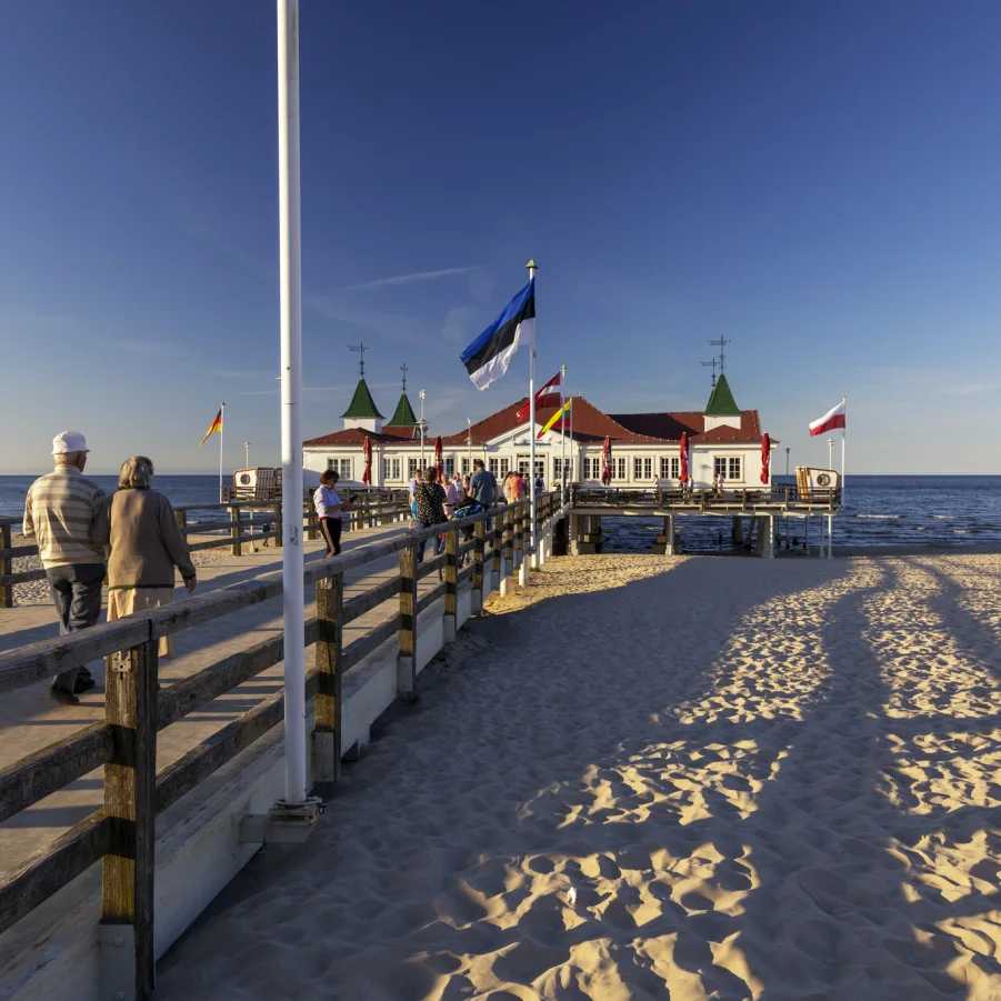 Heute erleben Sie auf Usedom - Deutschlands Sonneninsel Nr. 1 - einen Mix aus Strand, Natur und Kultur. Die weite Küstenlinie von Peenemünde bis Koserow lädt zu einem Strandspaziergang ein. Der Weg führt zwischen Ostsee und Achterwasser zu den drei Schwestern Bansin, Heringsdorf und Ahlbeck. Heringsdorf, das älteste Seebad auf Usedom, ist über eine Strandpromenade mit Bansin und Ahlbeck verbunden. Übernachtung in einem der Kaiserbäder (Bansin / Heringsdorf / Ahlbeck).