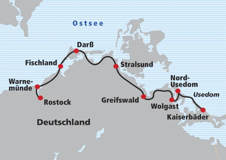 Vorbei an der Klosterruine Eldena, dem bekannten Motiv von C.D. Friedrich, führt Sie der Weg zur Insel Usedom. Ab Freest besteht die Möglichkeit, mit der Fähre (Ticket nicht inklusive) nach Peenemünde überzusetzen. Auf ruhigen Wegen radeln Sie über die Insel zur Seeseite durch Trassenheide und Dünenwäldchen zum Seebad Zinnowitz. Alte Hotels im wilhelminischen Stil haben das Flair vergangener Zeiten in Zinnowitz bewahrt. Übernachtung in Wolgast, Zinnowitz, Karlshagen oder Umgebung.