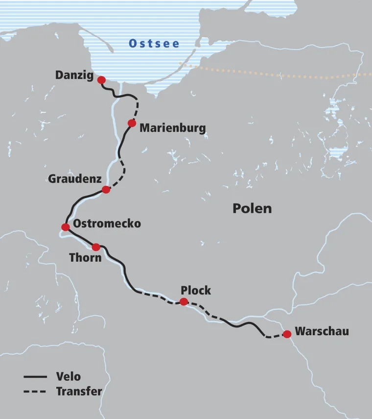 Nach dem Frühstück besichtigen Sie die Burg in Marienburg, der frühere Hauptsitz des Deutschen Ordens. Danach kurzer Busfahrt von Marienburg zur Weichsel in Tczew bzw. Kiezmark. Am Nachmittag von der Weichsel bis zum grünen Tor in Danzig folgen Sie dem Lauf der Motlawa/Mottlau – eine schöne Veloetappe durch das Land der Menoniten und die Weichselniederung. Vorlaubenhäuser und die vielen Entwässerungskanäle erinnern an das Erbe der damaligen Siedler. Anschliessend erreichen wir das Hotel in Danzig per Velo. Check-in im Hotel in Altstadtnähe und anschliessend fakultativ ein einstündiger Stadtbummel mit Führung durch die prächtige Hansestadt Danzig.